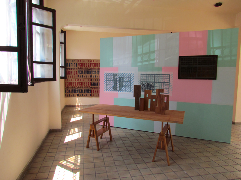 (sem título, imbuia e peroba rosa, dimensões variáveis, 2012) e projeto expográfico de Gilberto Tomé.