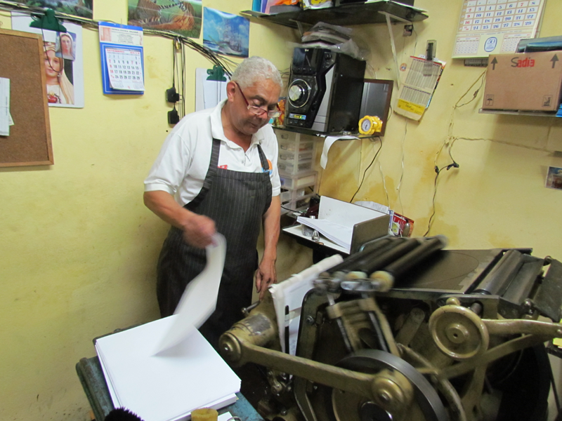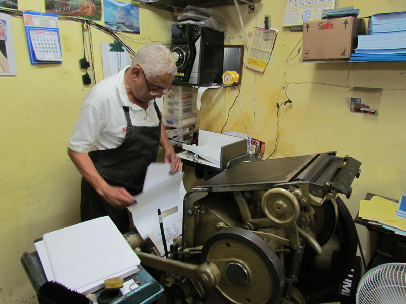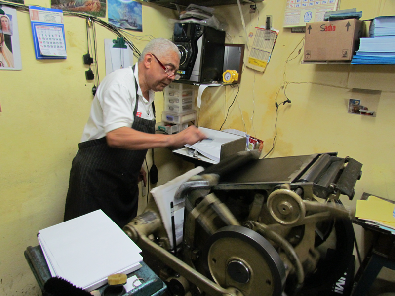 O mercado pra gráfica tá muito bom, mas o sujeito precisa ter uma grana pra investir. O maquinário hoje custa caro. Precisa ir com calma, mas, querendo, consegue. Tem hoje muitas gráficas, trabalhando com digital e offset. Tem a gráfica Futura, a gráfica das gráficas – que trabalha com vários tipos de gráfica –, é muita concorrência. Ganho muito serviço pelo preço. Cobro R$ 80,00 pelo milheiro de um receituário. E tem gente que reclama do preço. Já teve gente que pegou as coisas e foi embora, foi fazer com outro. Paciência, não posso fazer malfeito, cobro a minha qualidade, e tem um preço… Não dá pra fazer a preço de custo só, tem que ter uma compensação.