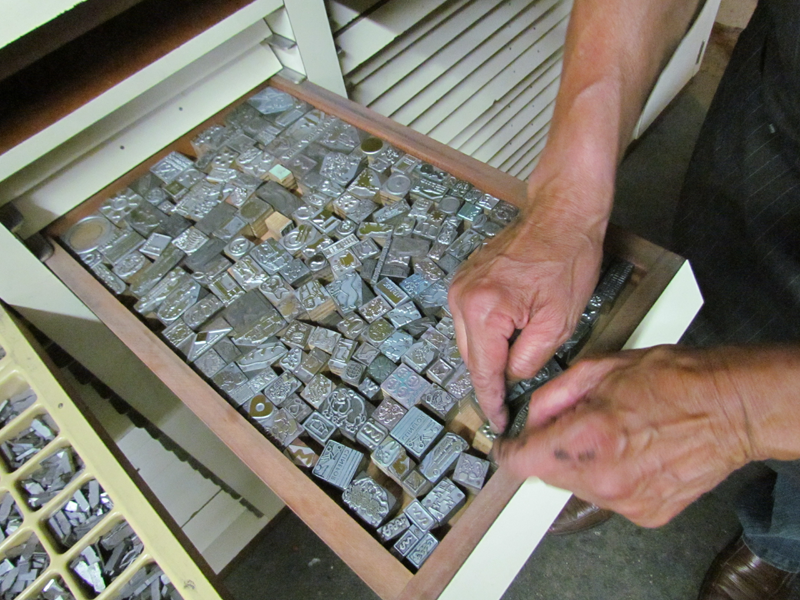 Comprei essa Catu aqui. Junto vieram uma meia dúzia de gavetas, os lingotes, os espaços, rama, tudo, mas nem era tanta coisa assim. Nunca estudei. Aprendi tudo na raça. E assim fui indo. Um tempo depois, outro conhecido também se desfez de umas gavetas. Arrematei. Veio esse móvel bonito com gavetas, olha só, de plástico, muito boas. Esse móvel era pra exportação, ia pros Estados Unidos. Acabei comprando mais uma máquina impressora um pouco mais nova, depois uma guilhotina e depois uma picotadeira.
