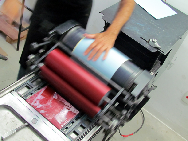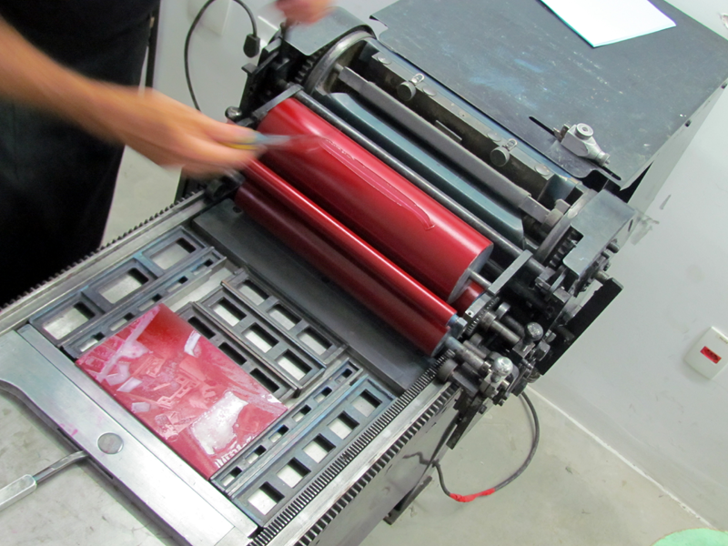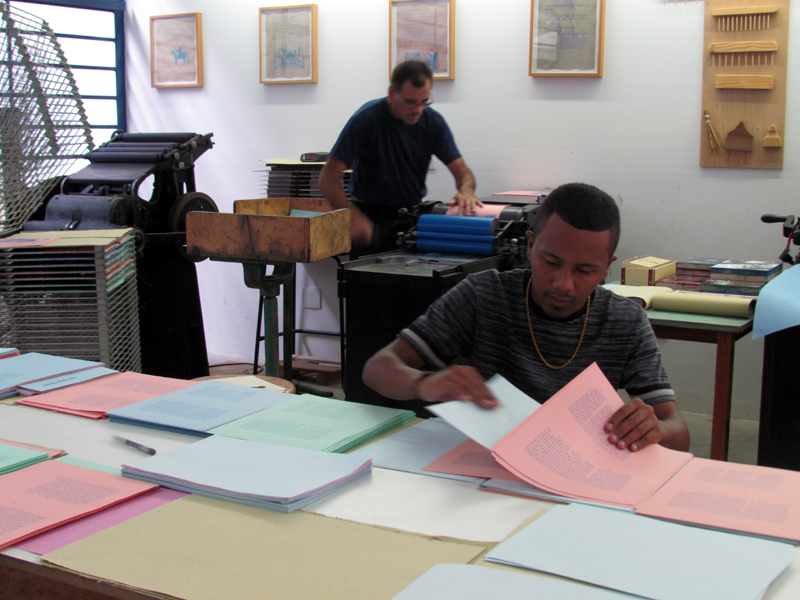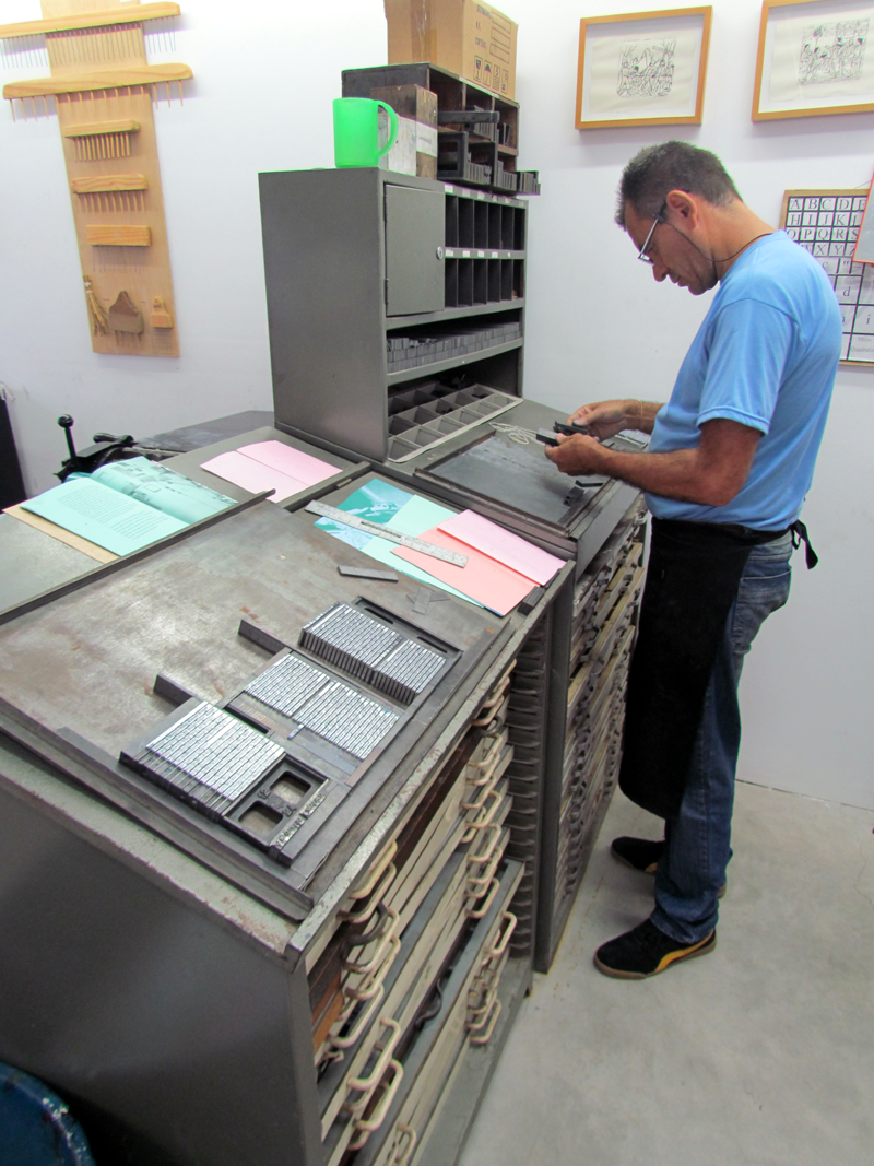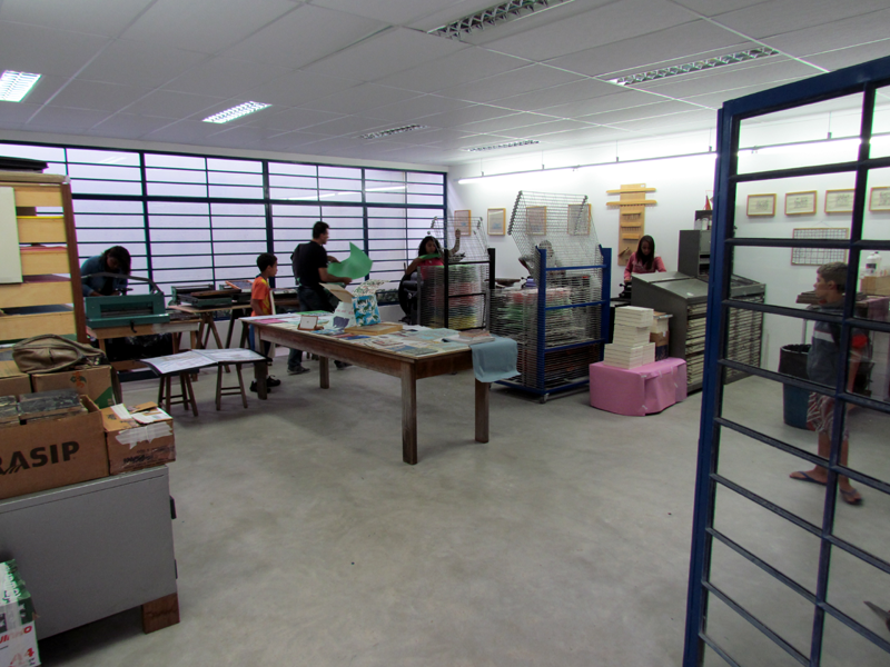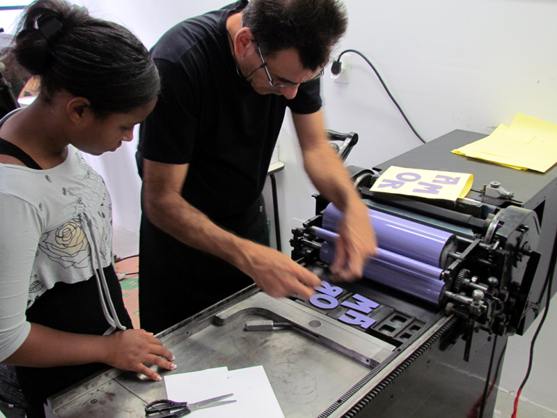 Hoje trabalho no ateliê tipográfico do Instituto Acaia, aqui na Lapa. Antes de sair do Grupo Artes, a empresa já tinha doado uma máquina e materiais gráficos pro Acaia. O Fabrício (Lopez) me chamou pra vir pra cá, organizar a oficina, fazer os impressos. Deu um trampo trazer essas outras máquinas e uma Minerva Catu. Então, as coisas foram migrando pra cá e eu fui fazendo esse trabalho com as crianças. Minhas experiências são assim, meio que entrelaçadas, né?