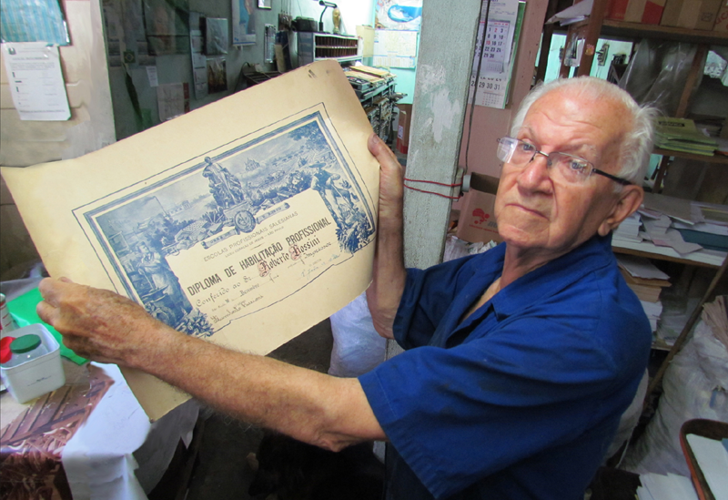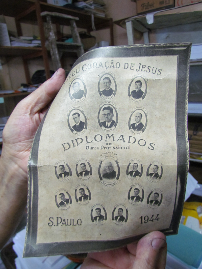 Toda manhã tinha missa, das sete às oito da manhã, inclusive aos domingos. Da missa você ia pro curso; de manhã era estudo, das oito às onze e meia, era o colegial. Depois almoçava, dentro do colégio, de graça. Tudo era de graça. Depois do almoço tinha as oficinas, de aprender ofício, até as cinco horas da tarde. Era semi-interno, à noite voltava pra casa. A gente aprendia tudo durante quatro anos. O Liceu era bom, porque tinha os chefes, os mestres, a maioria era italiano, os mestres de lá, que vieram da Itália pra ensinar a turma aqui… pessoas que sabiam bem esse negócio de artes gráficas, né?
