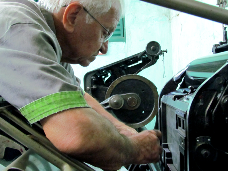 A parte de clicheria também está acabando, só tem uma lá na Zona Norte… O resto fechou tudo. Linotipo também já foi… Não tem mais quase… Linotipo, que eu conheço, só tem lá na Rua do Hipódromo. A fundição de tipo e o linotipo deixavam o cara meio estéril. O chumbo, o antimônio faziam muito mal pra saúde da pessoa. Quem trabalhava com linotipo morria mais cedo, por causa do chumbo. Agora tudo se faz no computador, então não tem mais problema. Linotipo antigamente a gente usava pra fazer bula pra laboratório, né? Mas, depois, como linotipo amassava logo, nós começamos a fazer clichê, aí a gente punha um monte de clichê na máquina, imprimia um monte de bula, mas nós tínhamos uma máquina superautomática, especial, que dobrava bula. Acho que no Brasil a única que tinha era a nossa. Dobradeira, dobrava em dois centímetros. Nós desistimos de fazer bula e rótulo, sabe por quê? Porque os laboratórios começaram a não pagar o preço que a gente pedia… A gente usava muito papel, resmas e resmas… A gente imprimia centenas e centenas de bulas por dia. Entregava nos laboratórios todo dia, por isso nós compramos o Opala. A gente tinha serviço, mas o preço que pagavam começou a ficar muito baixo, não compensava. Desistimos de imprimir bula de remédio. Não fiz mais nada e, de raiva, aquela dobradeira automática, vendi por qualquer preço pra nunca mais fazer bula.