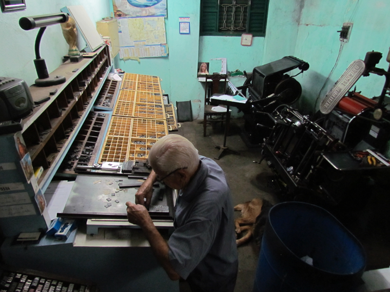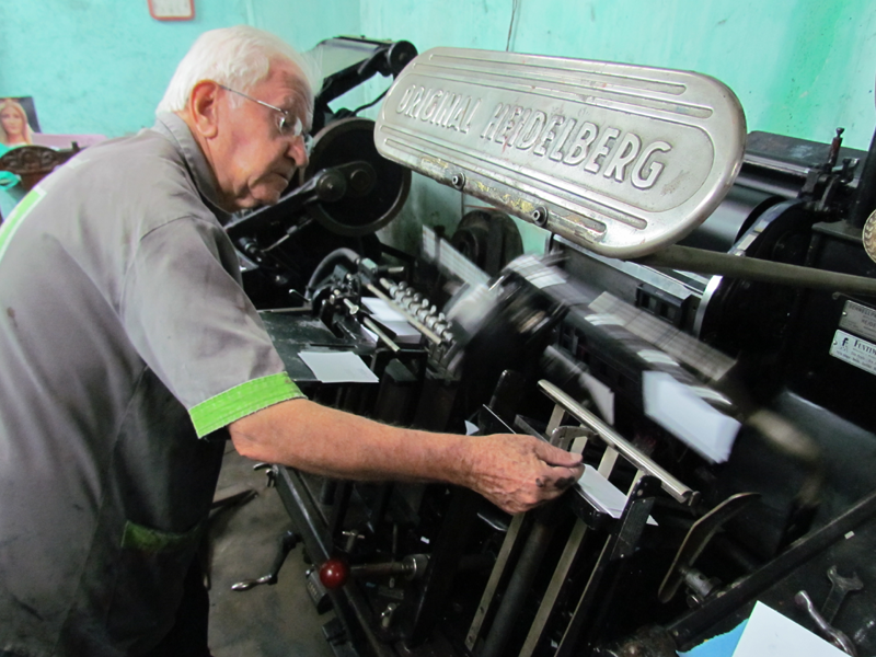 Essa tecnologia toda tá acabando com o ramo gráfico. Porque tem muita gente que faz as coisas muito barato, tá estragando a arte gráfica, tá caindo a qualidade. Eu não sei como eles fazem a 20 reais um milheiro de um cartão, se vai 15 de papel, eu não entendo nada desses cartões coloridos. E tem um monte de gráfica fazendo isso aí, né? E o próprio governo, por si só, tá acabando também com o ramo gráfico. Por quê? A prefeitura já não faz mais nota fiscal em papel, só nota fiscal eletrônica. Então, diminuiu o serviço de gráfica de todo jeito, né? Envelope ninguém mais faz, porque é tudo por computador… Então, o ramo gráfico diminuiu bastante o serviço e a maioria das firmas já fechou, até editora está indo pra falência. Tinha duas editoras aqui perto, faliram.